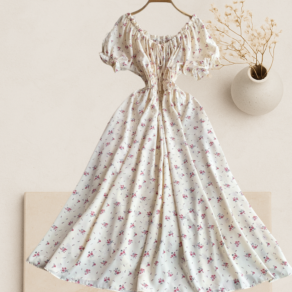 Flowy floral maxi designed for comfort and elegance. Crafted in a soft polyester blend, it features a flattering shirred waist, short puff sleeves, and a versatile neckline that can be worn on or off the shoulders. Plus, it comes with hidden side pockets — making it as practical as it is beautiful.