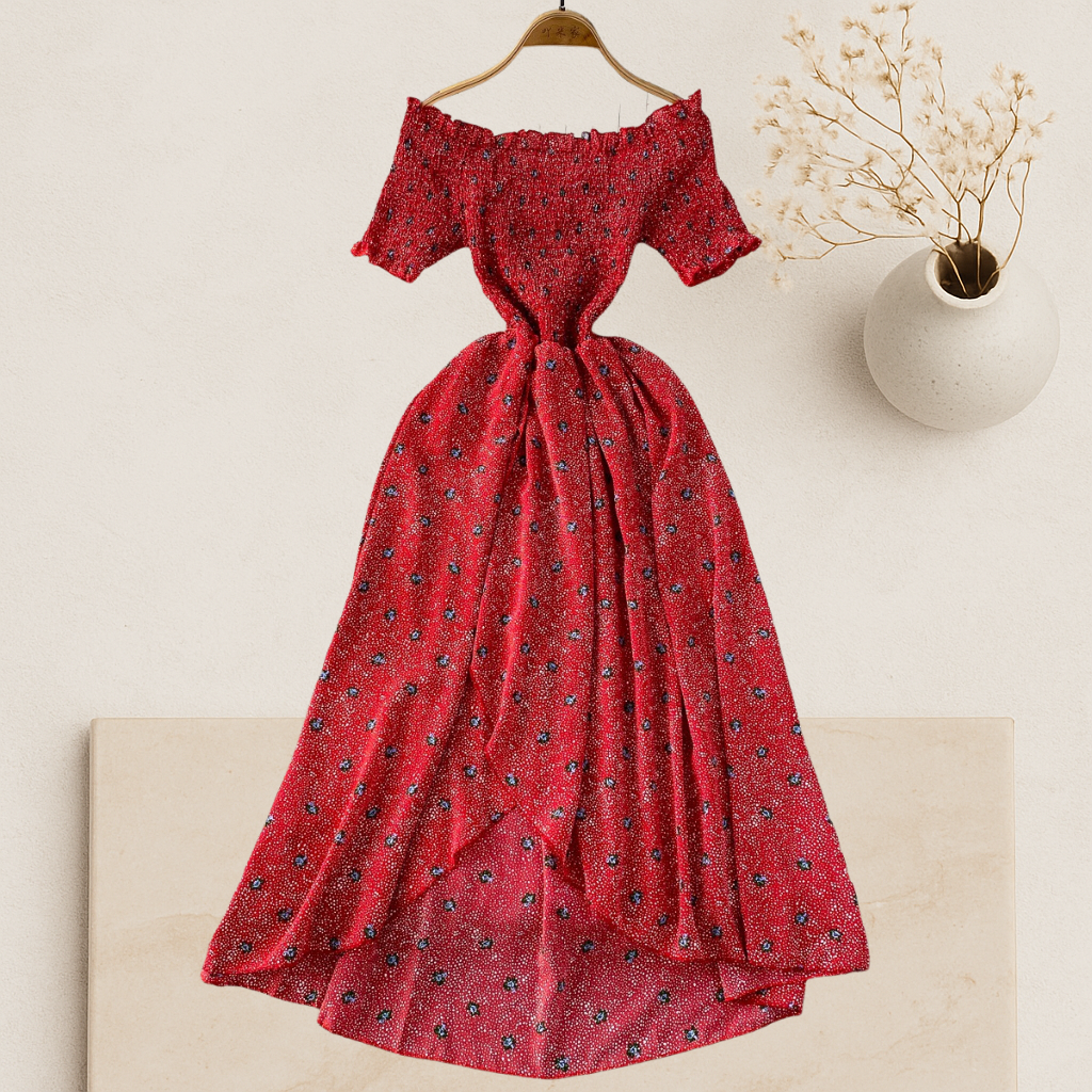 This flowy piece features a smocked bodice that stretches to flatter every curve, while the soft high-low hem sways beautifully with every step. Designed for warm days and soft moments — whether you’re sipping wine on a terrace or wandering through weekend markets.
